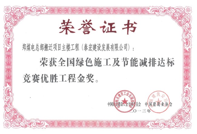 “十二五”期间,连续三年参赛了全国绿色施工及节能减排达标竞赛活动,均荣获金奖,为河南省唯一获此殊荣的企业。